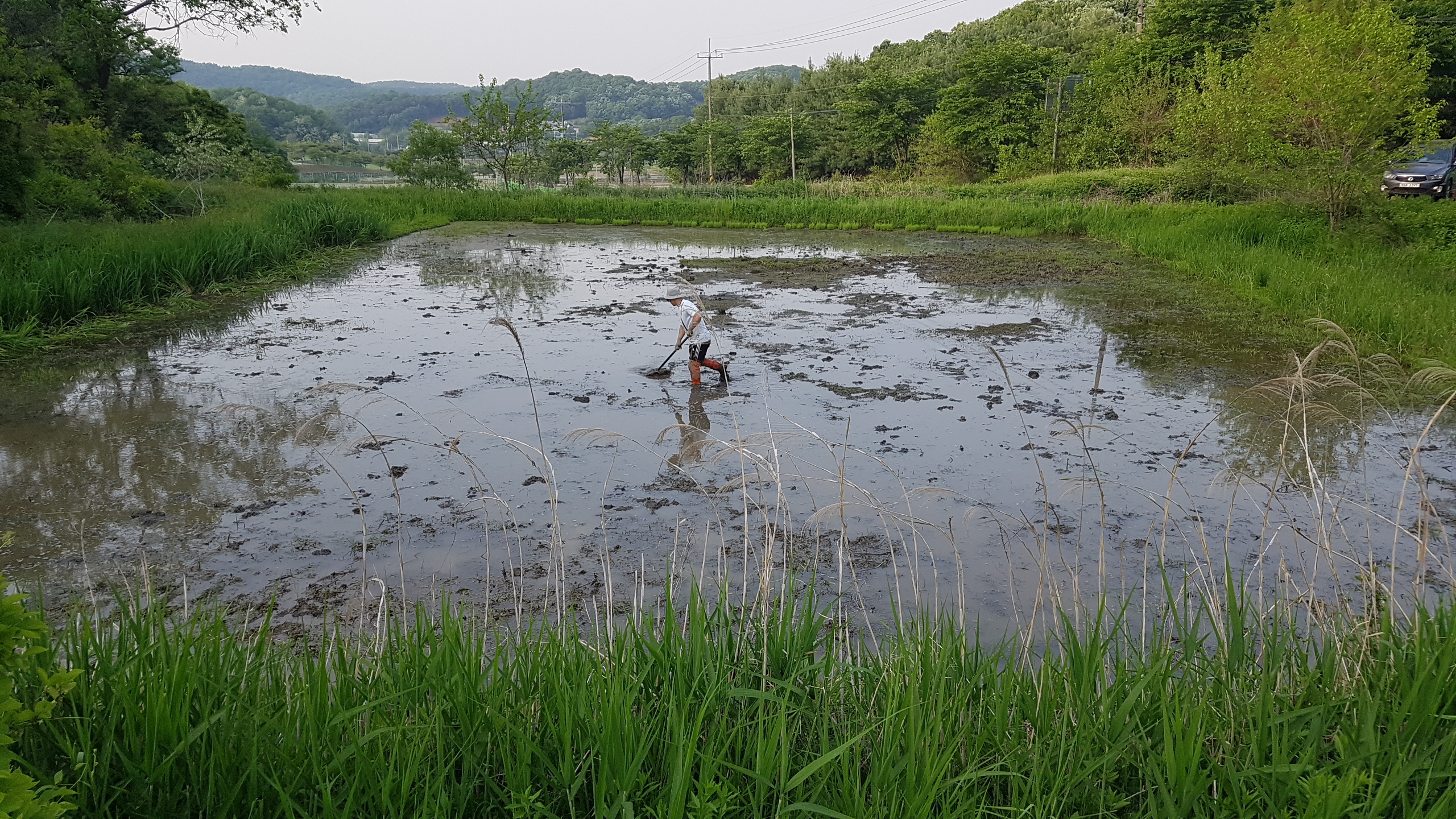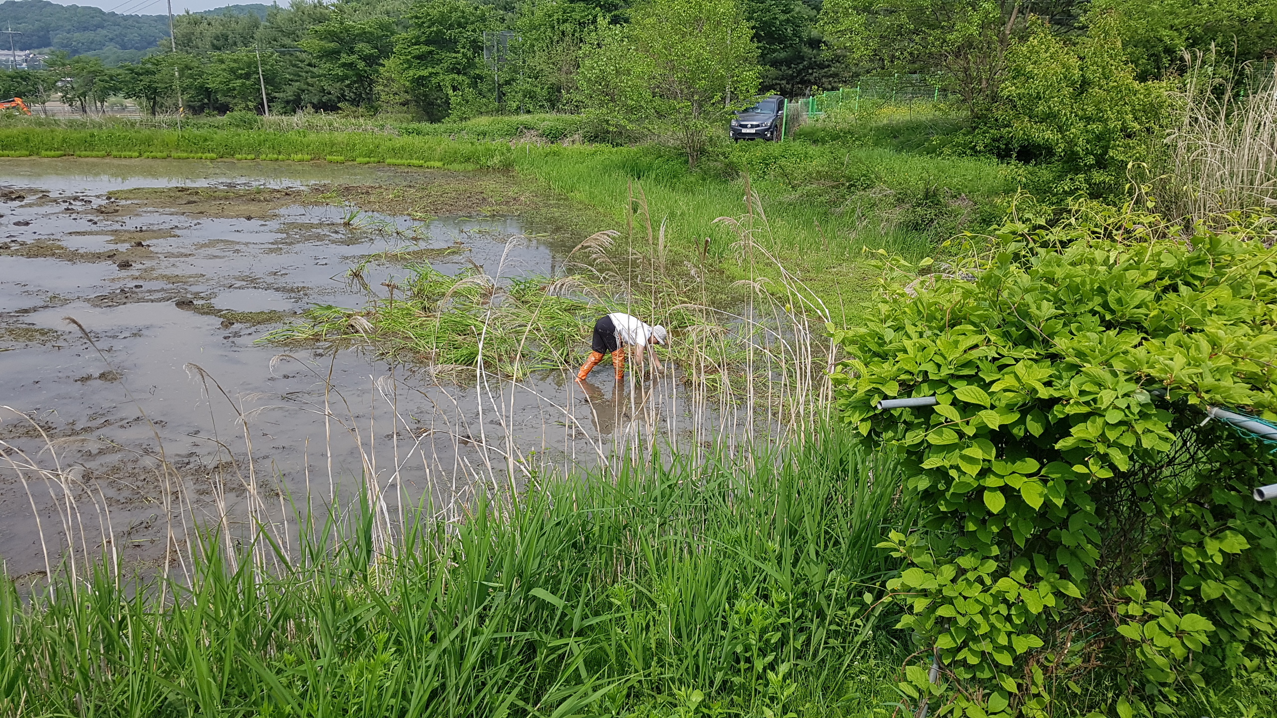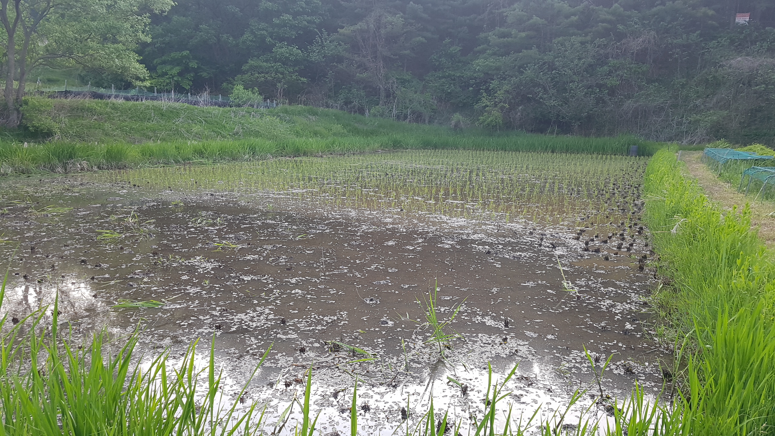1. 논죽 모내기를 마쳤다. 5.5일 걸렸다. 50cm 줄간격으로 모를 심어 37줄을 심었다. 줄간격이 너무 넓어 보인다. 40cm가 적당해 보인다. 현재의 논에서 2줄을 더 심을 수 있었고 동쪽 풀밭을 정리하면 4~5줄을 더 심을 수 있다. 볏모 3판 정도가 남아 논국으로 옮겼다. 18판을 파종하여 2판은 거의 발아가 되지 못한 것을 감안하면 13판으로 심은 셈이다. 볏모는 논국에 비하여 키가 크지는 않았지만 분얼이 더 진행되고 있었다. 볏모가 자리한 곳에 물이 많아 스크래퍼로 잘라 꺼내기 못하고 양손을 모 뿌리에 집어넣어 들어 뽑아냈다. 뿌리가 길어 가위로 3~4cm 길이로 뿌리를 잘랐다. 특히 모판에서 모가 흩어져 3포기씩 모아 심어 놓은 볏모는 키도 크고 1포기가 2~3포기처럼 보일만큼 분얼도 잘 진행되었다. 모내기 일정을 더 앞당겨도 될 가능성이 보인다. 모내기를 마치고 수위를 2~3cm 높여 놓았다.