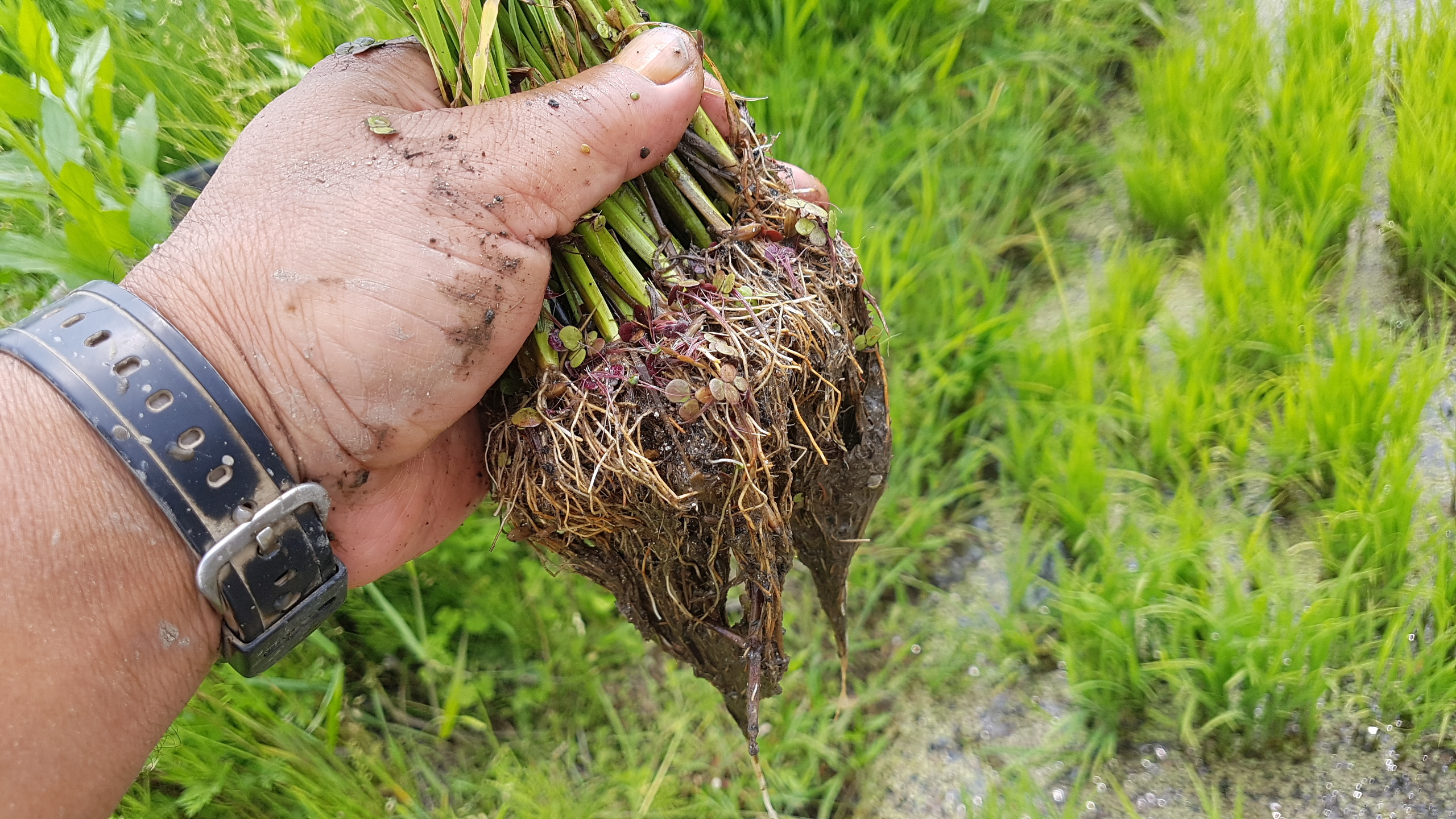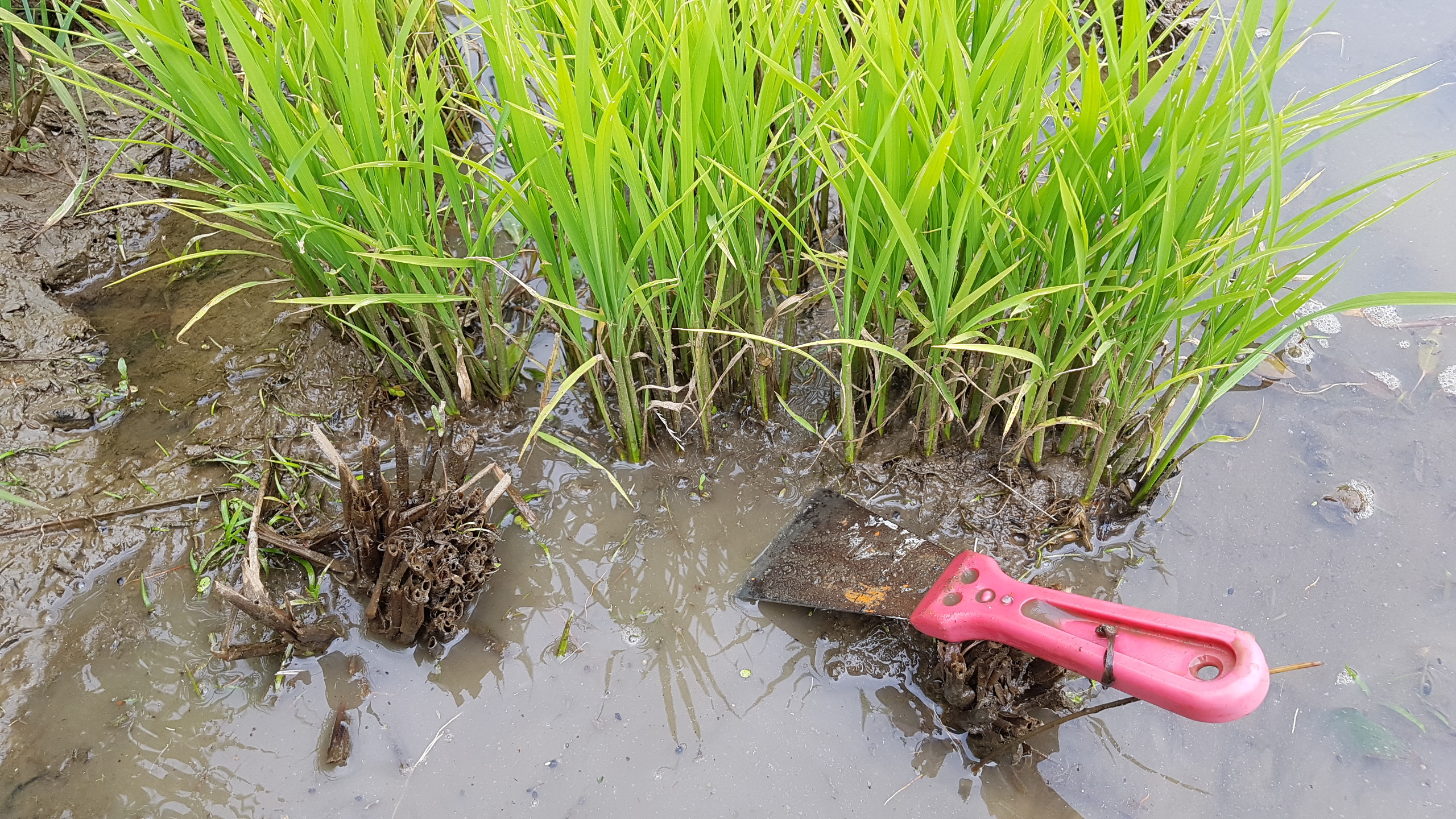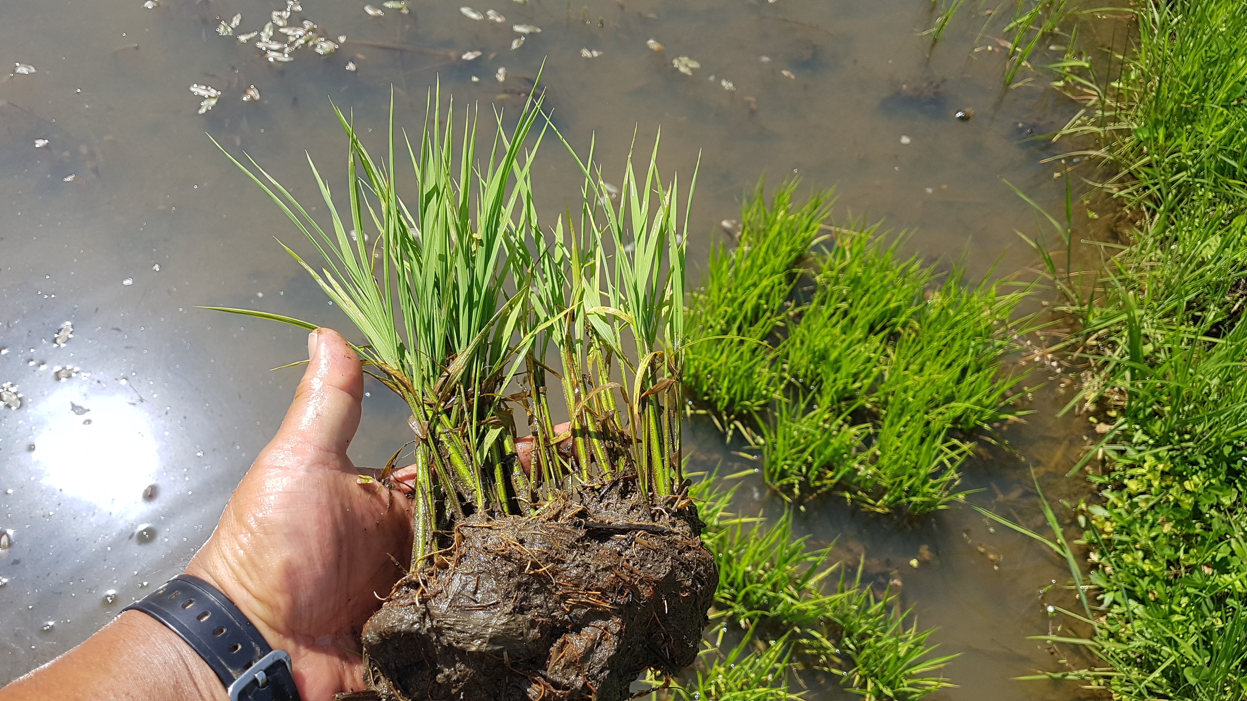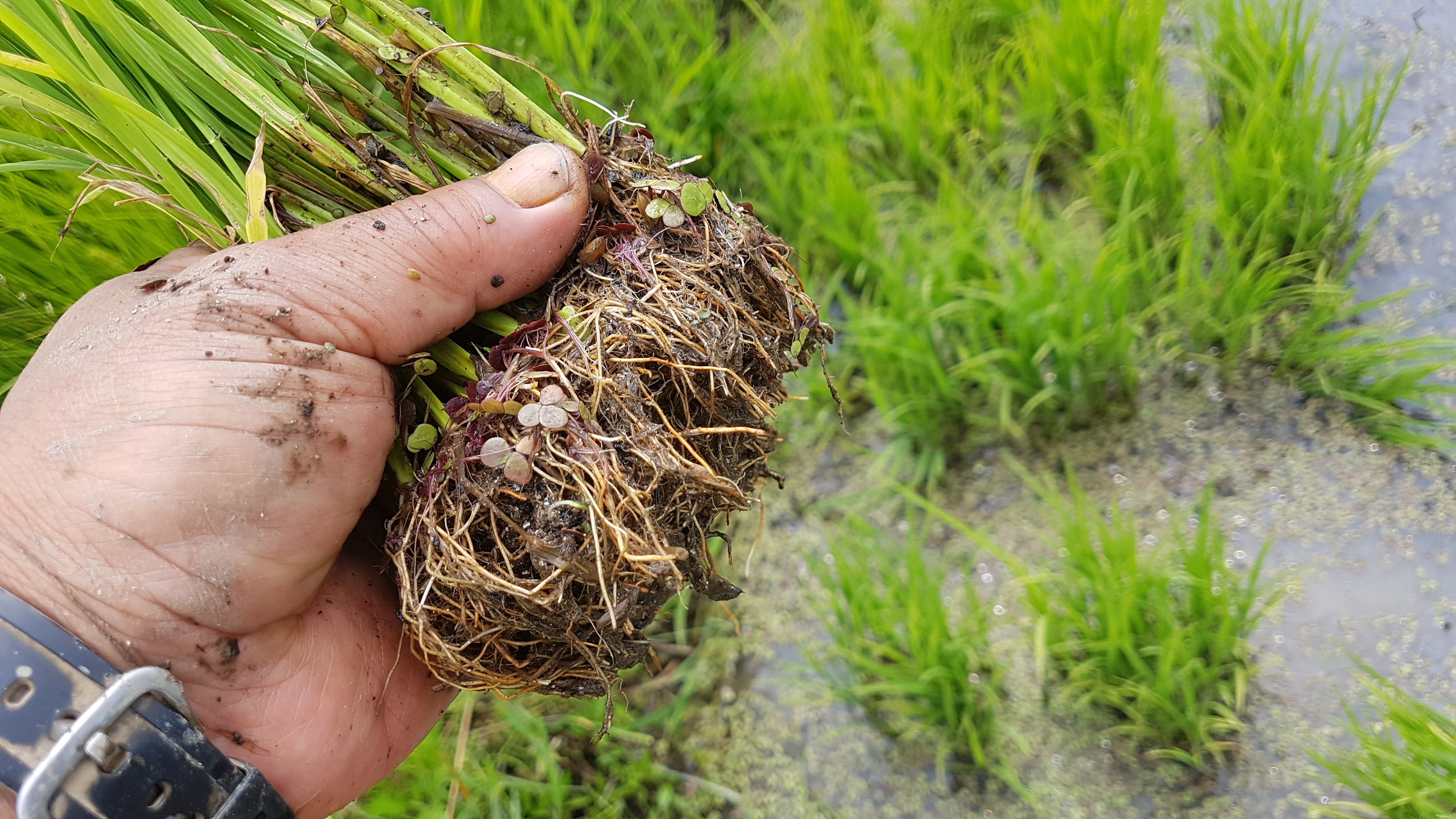 3. 논국 볏모를 꺼내 보았다. 뿌리가 논에 박혀 잘 뜯어지지 않는다. 뿌리를 자르는 것보다는 가능한 긴 뿌리를 그대로 심는 것이 좋을 것으로 본다. 작은 모종삽 같은 것으로 뿌리를 떠내는 것이 좋겠다. 파종한지 37일이 지나고 지난 4월23일 논에 가식한 이후 보름 정도가 지났다. 그동안 제법 잘 자라 키도 20cm가 넘고 줄기도 빳빳하게 힘이 들어갔다. 모가 더 자랐으면 하지만 길밭 정식이 끝나는 대로 2~3일내로 모내기를 시작하기로 한다. 논국의 수위를 조금 낮추었다. 모내기 때보다 물을 덜 뺀 상태에서 논바닥을 먼저 고른 후 그대로 모내기를 하고자 한다. 논죽에서는 예정대로 45일 정도 육묘한 볏모를 볼 수 있을 것 같다.