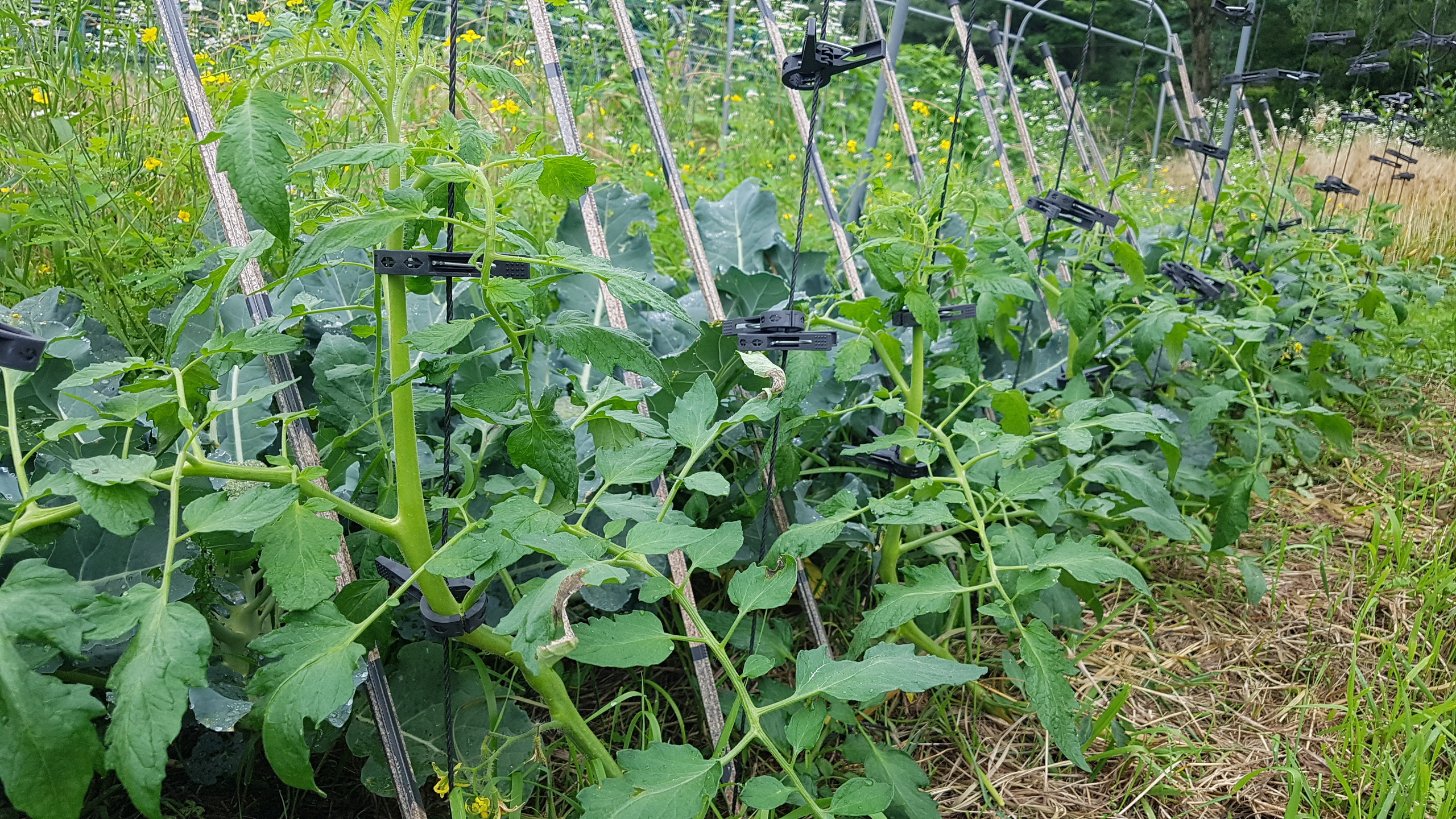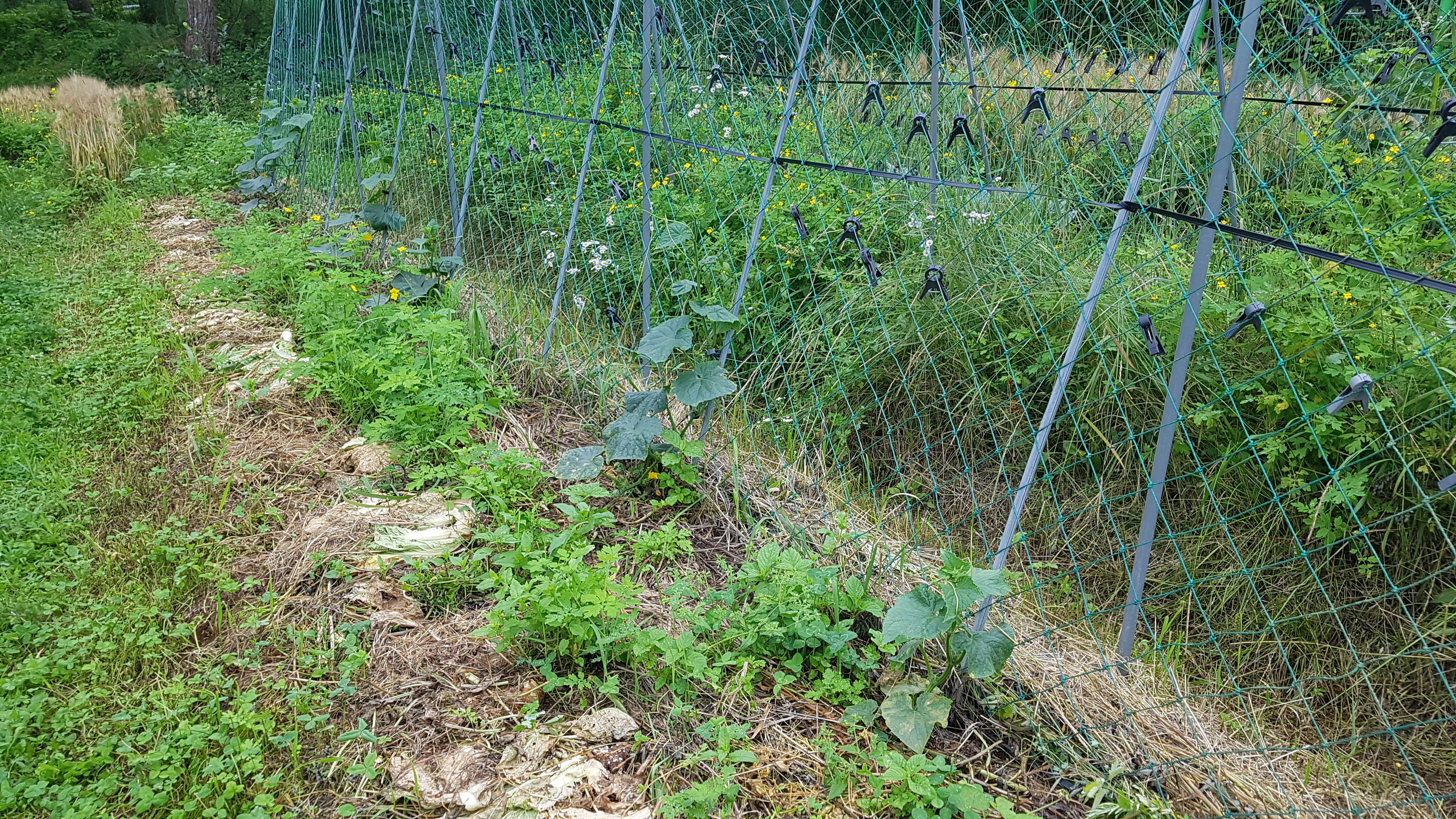 4. 토마토는 덩굴 위쪽을 한번 더 고정시켰다. 조금 더 자라게 한 후 45도 각도를 고려해 오른쪽 유인줄로 넘긴다. 오이는 유인망을 잘 타고 오르고 있다.