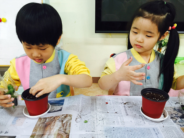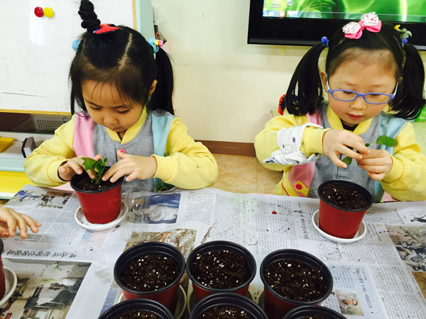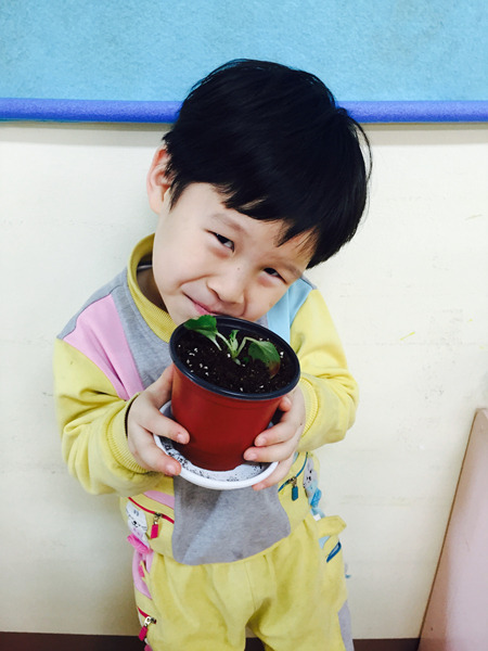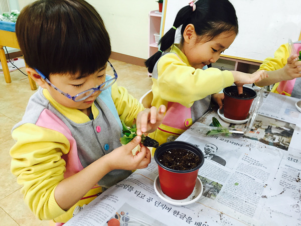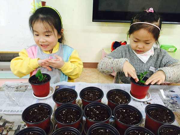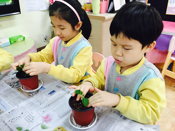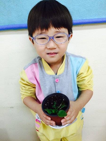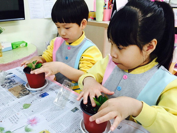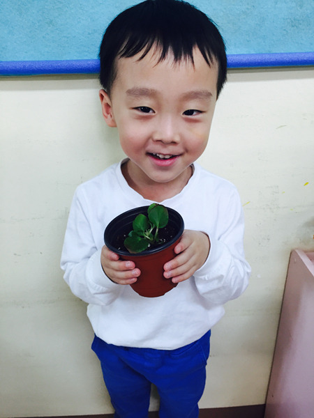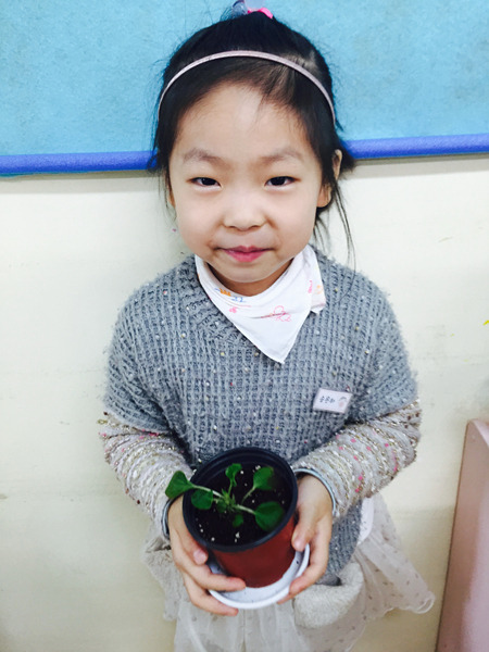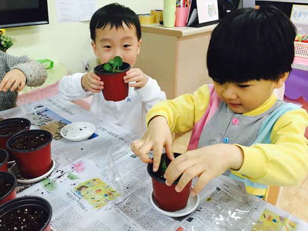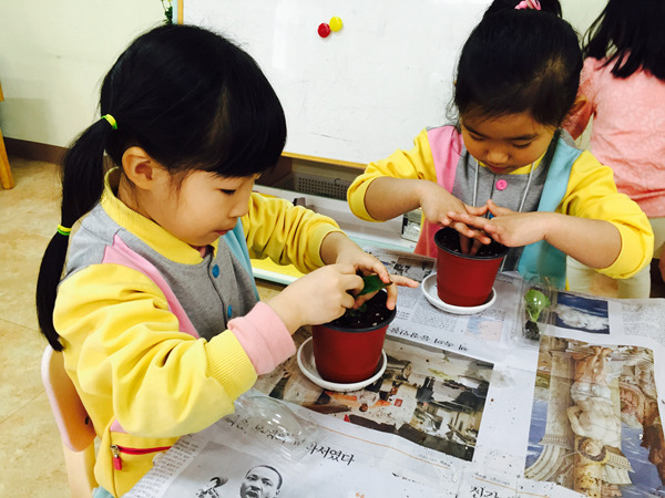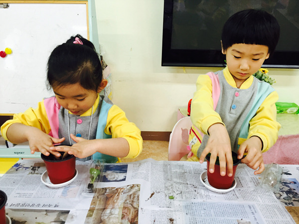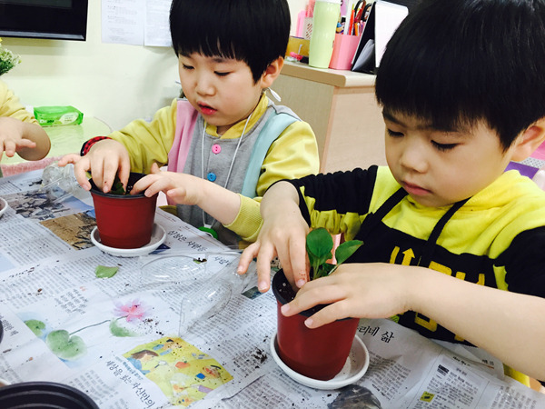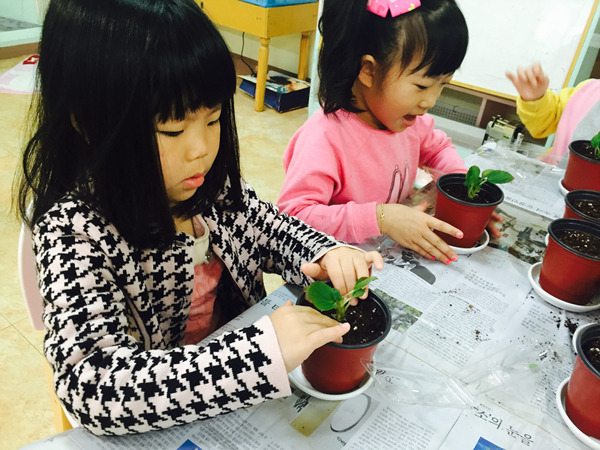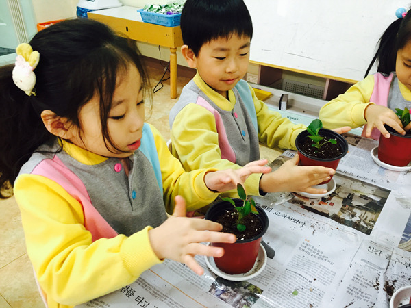 화분에 담긴 부드러운 흙과 꽃 모종을 탐색하면서 친구들 정말 즐거워했어요~^^