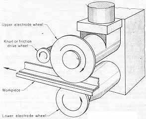 그림과 같이 원판 전극을 사용하여 용접전류를 공급하면서 가압 회전시켜 점용접을 연속적으로 행하면 선용접인 seam 용접이 되며, 액체의 누설(漏泄)를 막고, 기체의 기밀(氣密)을 요하는 용기 및 관 등의 용접에 이용된다. seam 용접에 공급되는 전류의 일부는 이미 용접된 인접 용접부로 흘러 손실되고, 일부는 원판 전극 사이에 흐르므로 대전류를 요한다. 통전법에는 단속통전법(斷續通電法), 연속통전법 또는 맥동통전법(脈動通電法)을 채용하나, 대전류를 연속적으로 공급하면 열량이 과대하여 용접부 전체를 용융시키므로 단속적인 통전을 하는 경우가 많다. 강의 경우에는 (통전시간) : (휴지시간)=1 : 1, 경합금(輕合金)의 경우에는 (통전시간) : (휴지시간)=1 : 3 정도이다. seam 용접의 전류는 점용접의 1.5 ~ 2배 정도이며, 가압력은 1.2~1.6배 정도이다. 전극의 내부 또는 외부를 수냉하여 전극이 과열되는 상태를 피한다.