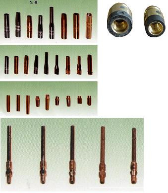 토치 부품의 종류는 <그림2>과 같이 와이어를 송급하는데 필요한 부품과 보호가스를 분출시키는데 필요한 부품으로 되어 있다. 그림에서 스프링 라이너(spring liner)는 와이어 송급장치로부터 토치 몸체까지 와이어가 원활하게 송급되도록 안내하는 역할을 하며, 가스분출기는 토치 내부의 가스 공급 호스로부터 나오는 가스를 분출시키는데 사용된다.