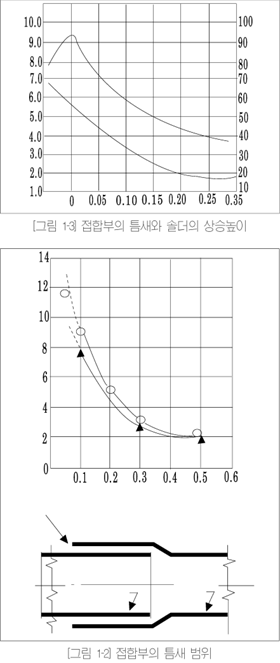 겹침부의 틈새는 모세관현상과 접합부의 인장강도와 밀접한 관계가 있다. <그림 1-2>은 큼새외 인장강도와의 관계를 표시한 것으로 겹침부틈새가 0.04mm부근에서 가장 높은 인장 강도를 갖는다. 동관의 용접접합에서 요구되는 겹침부의 틈새는 <그림 1-1>와같이 0.04∼0.127mm가 적당하다.