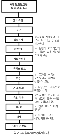 가. 길이측정하여 직각절단(동파이프 캇타기, 전동캇타기)한후 덧살을 리머를 사용하여 완전히 제거하고 찌그러진관은 확관기를 사용하여 진원이 되도록 교정한다. ※솔더링에서 확관은 하지않으며 꼭 필요한 경우는 400℃미만(터지지않을정도)저온가열한 후 확관하여 사용하며 과열이 되면 용접접합이 되지않음)