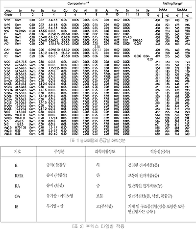 솔더링에 사용되는 용접재를 솔더메탈이라며, 솔더메탈은<표 1>과 같이 35종으로 구분되고 주석의 함량또는 안티몬이나 은의 함량을 기준하여 호칭한다.
