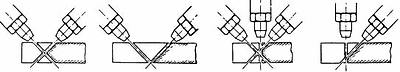 gas 절단에는 수동절단(手動切斷)과 자동절단(自動切斷)이 있으며, 아래 그림은 torch tip의 형태, tip의 각도 및 tip과 가공물간의 간격을 보여 준다.