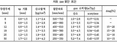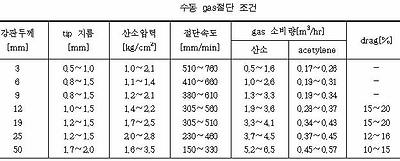공작물을 절단할 때 절단기가 이동대와 함께 track 위를 자동 이동하면서 직선 또는 곡선절단할 수 있는 자동절단기가 있다. 아래 표의 조건에 따라 강판과 torch tip 간의 거리 등을 선정하고, 절단 시작점을 충분히 예열하여 용융점에 이를 때 순수 산소 valve를 열어 산화, 분출시키면서 이동대를 track상에서 이동시켜 절단한다.