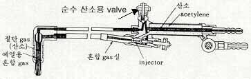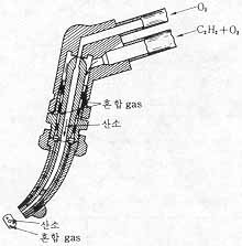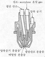절단 torch에는 예열용 acetylene gas의 압력을 기준으로 하여 저압식(低壓式, 0.07kg/cm2 이하)과 중압식(中壓式, 0.07kg/cm2 이상)이 있으며, 그림은 저압식 torch로서, 예열용 산소-acetylene 혼합 gas 도관과 순수 산소만을 보내는 도관으로 되어 있다.