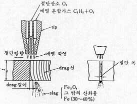 gas 절단에서는 절단홈의 밑으로 갈수록 slag의 방해, 산소의 오염 등에 의하여 산화작용이 느리고, 불어 내는 압력이 저하하기 때문에 그림과 같이 上下의 절단거리에 차이가 생기며, 이 차이를 drag 또는 drag 거리라 한다. 이 drag는 절단성을 판정하는 기준이 되며, 절단속도, 산소소비량 등에 따라 변하고, 절단속도가 아주 느리면 drag는 0 이 된다. 산소량과 산소압력을 증가시키면 drag는 짧아지나, 산소압력을 증가시켜도 더 이상 drag가 짧아지지 않는 한계가 있다. drag가 길게 되는 조건에서 절단하면 절단비용은 감소하나, 절단깊이의 밑부분에서는 절단이 되지 않을 수도 있으므로 drag는 강판두께의 20% 정도가 작업능률의 관점에서 좋다.