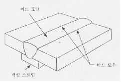 반자동 / seni-automatic (arc) welding 용접 와이어의 송급은 자동적으로 이루어지는 장치를 이용하고, 용접토치의 조작은 손으로 하는 아크용접법을 말한다. 반자동 아크 용접은 기계회된 수동요접으로 분류하기도 한다. 용극식의 반자동 아크 용접기는 용접토치, 와이어 송급장치, 제어장치, 아크용접 전원 및 보호가스 실린더 등 부속기기로 구성되어 있다. 용접토치는 용접 와이어를 용접부에 정확히 인도함과 동시에 용접전류를 공급하기 위한 장치이다. 소전류용이나 플럭스코어드 와이어용은 공랭식 토치가 널리 이용되지만 대전류 가스실드 아크 용접에는 수냉식을 주로 사용한다. 보호가스는 와이어와 동축으로 토치선단에서 분출시킨다. 직경이 작은 용접 와이어를 이용하는 토치는 와이어 송급장치를 토치와 일체화하는 것도 있다 솔리드 와이어용 용접전원은 직류 정전압 특성이 일반적이지만 플럭스코어드 와이어용은 교류수하특성의 용접전원이 사용된다. 제어장치는 와이어의 송급제어, 용접전원의 개페 또는 제어, 보호가스의 송급 및 정지 등을 수행하는 기능을 갖는다. 반자동 아크 용접기는 CO2 용접을 비롯한 가스메탈 아크용접(GMAW)에 주로 이용되며 가스텅스텐 아크용접(GTAW)에서는 용가재(와이어)의 송급만을 자동화한 것이 이 범주에 포함된다. 백비드 / penetration bead, back bead 용접이음부의 용접표면에 대하여 뒷면에 형성된 용접비드를 말한다. 편면 1패스 맞대기 용접에서 완전용입 용접(full penetration welding)을 행한 경우에는 뒷면에 완전용입으로 형성된 비드를 백 비드라고 부른다. 그러나 X그루브 등으로 가공된 후판재의 양면 용접에서는 앞면의 용접부에 대하여 뒷면에 형성된 용접비드를 의미한다.