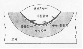 용접부 / weld, weld zone 용접금속 및 열영향부를 포함하는 부분을 총칭한다. 용융용접의 용접부는 그람과 같이 몇 개의 영역으로 상세하게 구분되기도 한다. - 완전혼합역(composite region)은 모재와 용접재료가 용융하여 완전히 혼합된 영역을 말한다. - 미혼합역(unmixed zone)은 모재는 완전히 용융되었지만 용접재료와 전혀 혼합되지 않았거나 불완전한 상 태로 응고한 부분으로서 불완전 혼합역이라고도 한다. - 부분용융역(partially melted zone)은 완전혼합역, 미혼합역과 고상영역의 사이에 존재하는 천이영역을 말 한다. - 용융선(fusion line)은 미혼합역과 부분용융역의 경계선이지만 통상 용접금속과 열영향부의 경계선을 의미 한다. - 용접열영향부(HAZ)는 용융선과 모재사이에 형성되는 영역으로 고상에서 조직변화가 일어난 부분을 말한다.