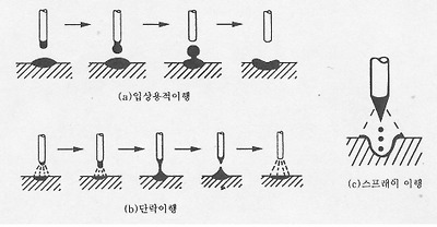 용적이행 / droplet transfer, metal transfer 아크 공간을 통하여 용접봉 또는 용접와이어의 선단으로부터 모재측으로 용융금속이 이행하는 것을 말한다. 이행형식은 보호가스나 전류에 의하여 달라지며 크게 다음과 같은 세 형식으로 나눌수 있다.