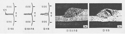 기공 / porosity 사진과 같이 용접금속의 내부에 생성되는 공동(空洞)을 말한다. 가스포켓(gas pocket)이라고 부르기도 한다. 이 결함은 용융금속에 용해한 다량의 수소가 응고시에 용접금속으로부터 방출될 때 또는 용융금속 중의 탄소가 산화물과 작용하여 CO가스를 만들고 이 가스가 용접금속의 내부에 잔존하거나 방출도중에 응고가 완료함으로써 생긴다. 모재의 특성, 이음부의 오염, 수분, 용접전류와 아크길이, 급랭 등의 조건이 나쁜 경우에 발생하기 쉽다. 기공은 형태에 따라 그림에 나타낸바와 같이 세 가지로 구분한다. 기포의 성장속도보다 계면의 성장속도, 즉 응고속도가 대단히 빠르면 비드표면에 침으로 찌른것과 같이 크기가 매우 작은 핀홀(pinhole)이 생성된다, 이보다 응고속도가 약간 느리면 기포가 성장한 상태로 응고하므로 구상의 블로우홀(blowhole)이 생성된다. 이와같은 브로우홀 중에서 형태가 길고 좁은 형상의 기공을 웜홀(warmhole)이라고 한다.