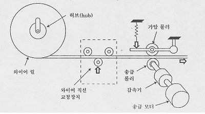 와이어 송급장치 / wire feel unit, wire drive unit 와이어를 스풀(spool) 또는 릴(reel)에서 뽑아 토치 케이블을 통해 용접부까지 일정속도로 공급하는 장치를 말한다. 와이어 송급장치는 송급모터, 감속장치, 송급롤 및 송급속도 제어장치로 구성되어 있다