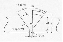 루트 / root 아래보기 용접이음부에서 그루브의 아래부분을 말한다. V, U, J형 그루브에서는 일정한 각도로 그루브가 가공된 부재의 가장 근접한 부분, Ⅰ형 그루브에서는 백킹재에 접한 부분, 그리고 필릿 이음에서는 두 부재 표면의 교차선이다 루트간격 / root gap, root opening 그루브 하부의 간격을 말한다.