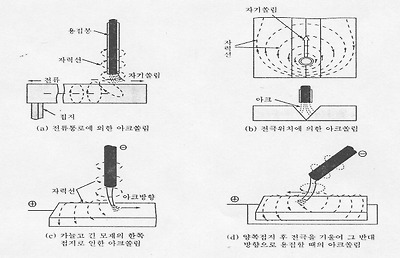 아크쏠림 / arc blow, magnetic arc blow, magnetic blow of arc 아크가 전류의 자기작용에 의하여 한쪽으로 쏠리는 현상을 아크쏠림이라 말한다. 직류에서 피복되지 않은 나봉(裸棒)을 사용하는 경우에 많이 나타나는 현상으로 용접전류의 아크주위에 유기되는 자장이 아크에 대하여 비대칭인 경우에 발생한다. 용접을 시작하는 부분과 끝내는 부분에서 아크가 안쪽 방향으로 강하게 쏘리게 되며 이거을 방지하기 위해서는 교류용접을 사용하는 것이 효과적이다. 또 낮은 전압일수록 아크가 짧고, 직진성이 강하여 높은 전압일때와 비교하여 아크솔림의 영향이 적게 나타난다.