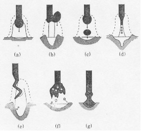 중저전류 GMAW 중전류 GMAW 고전류 GMAW SMAW 2) 브리징(bridging)이행 ㆍ단락(short circuiting)이행 ㆍ연속브리징(bridging without interruption) GMAW(단락조건), SMAW 용가재를 첨가하는 용접 3) 슬래그 보호(slag-protected)이행 ㆍ플럭스유도(flux-wall guided)이행 ㆍ기타 SAW SMAW, FCAW, ESW (a) 입상용적이행 (b) 반발이행 (c)프로젝티드이행 (d)스트리밍이행 (e)회전이행 (f)폭발이행 (g)단락이행