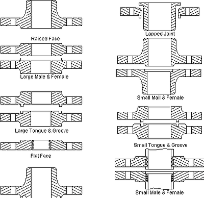 1) Welding Neck : "high hub"플랜지로 응력을 파이프로 전달하여 플랜지면에서의 고응력을 줄인다. 가격이 다른 플랜지에 비하여 비싸다. 2) Slip-On : "Low hub"플랜지로 Bore크기가 연결하는 파이프의 외경보다 약간 크게 되어 있다. 가격이 Welding Neck에 비해 싸나 high stress가 걸리는 부분에는 적 당치 않다. 3) Threaded (Screwed) : Slip-On플랜지와 유사하나 Bore가 Thread로 되어있어 용접없이 연결이 가능하다. 상온의 낮은 압력 혹은 용접이 위험한 가스폭발가능 구역에서 사용한 다. 4) Lap Joint : Slip-On과 실제적으로 같으나 Lap-Joint Stub를 수용하기 위한 구조로 되어 있다. 5) Socket Welding : Slip-On플랜지에 비해 파이프 내경과 크기가 같은 Bore가 하나 더 있다. 6) Blind : Bore없는 플랜지로 압력용기의 개구부나 파이프끝단을 폐쇄하는데 이용된다.