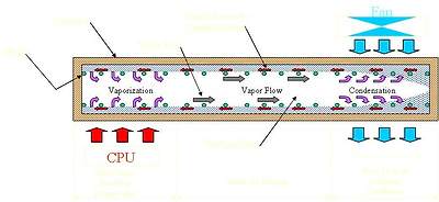 Heatpipe 는 증발부, 단열부, 응축부로 구분되고 구성요소로는 Container, Wick, Working Fluid 가 있으며 증발부로 열이 가해지면 Working Fluid가 동작하며 기화하여 단열부를 지나 응축부로 열을 전달하고 Working? Fluid는 액화되어 Wick 을 통하여 다시 증발부로 되돌아 오게 된다.이러한 일련의 과정을 반복하면서 열원의 열을 이동시켜 냉각효과를 가지게 한다.