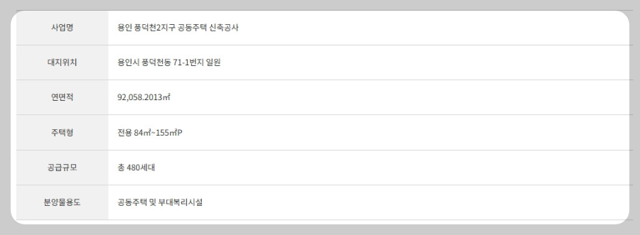 해당 분양 사업지 아파트는 용인시 풍덕천동에 위치하며, 총 480세대 규모로 계획되어 있어요. 이 아파트는 현대적인 디자인과 다양한 편의시설을 갖추고 있어, 주거 환경이 매우 쾌적할 것으로 기대돼요.