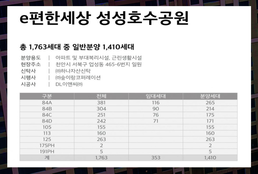 e편한세상 성성호수공원 업성구역은 천안시 서북구 업성동 465-6번지 일원에 위치하며, ㈜숲이랑코퍼레이션이 시행을 맡고 있는데요,