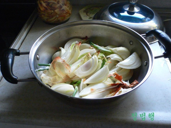 먼저 양파는 껍질채 잘씻어 썰어 냄비에 깔아준다