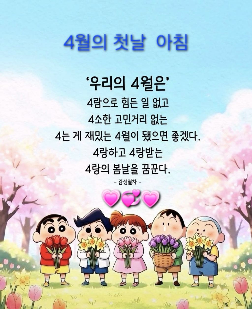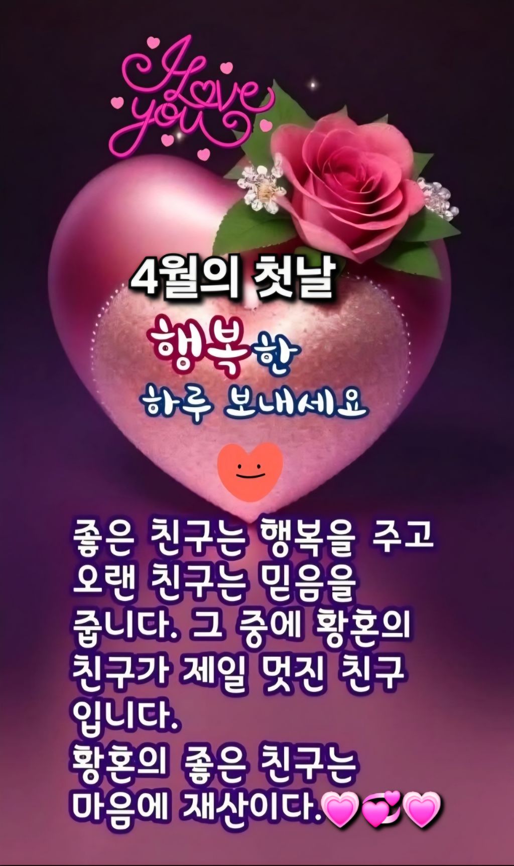 ♡4월1일 수요일 카톡인사! 작성자조운*|작성시간26.04.01|조회수35 목록 댓글 2 글자크기 작게가 글자크기 크게가 다음검색 현재 게시글 추가 기능 열기 북마크 공유하기 신고 센터로 신고 댓글 댓글 2 댓글쓰기 답글쓰기 댓글 리스트 작성자경기 광주 지부장 전진 | 작성시간 26.04.01 지부장님 예쁜사진 감사합니다. 오늘도 좋은 일만 있길 바랍니다. 고맙습니다 작성자조운* 작성자 본인 여부 작성자 | 작성시간 26.04.01 광주 지부장님오늘은 날씨가 흐리고 좀은 쌀쌀합니다 항상 건강하시고 행복한 시간 보내시기를 기원합니다 감사합니다 댓글 전체보기