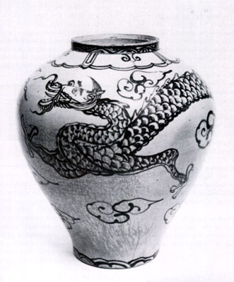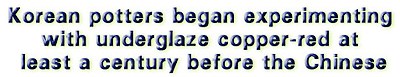 Finally, attention should be drawn to another technical invention which seems likely to have been made by the Koreans in the latter part of the twelfth century, namely the use of copper-red decoration under the glaze. It is a fair assumption that copper-red decoration was introduced to China from Korea during the period of Mongol domination, since the earliest Chinese porcelains with this type of ornament are believed to date from the late thirteenth or fourteenth century and there are no grounds for supposing that the technique was derived from Western Asia, like the use of cobalt blue.
