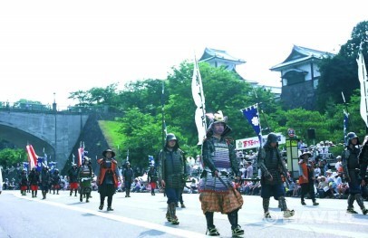 무사의 행렬을 재현한 이시카와현 가나자와의 햐쿠만고쿠 마쓰리(百万石祭り). 전투를 위한 복장인 요로이(鎧)를 입고 가부토(兜)를 썼다.