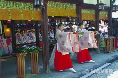 무녀복장(巫女服装) - 무녀 즉, 미코(巫女)는 신사에서 신을 모시는 여성이다. 노래와 춤으로 신을 위로하거나 신사 내에서 여러 가지 일에 종사한다. 화려한 붉은 하카마(袴)를 입는다.