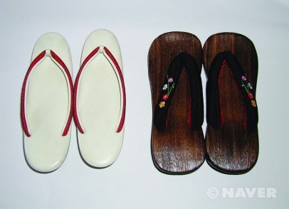 게타(下駄·우)와 조리(草履·좌) - 게타는 목제로 평상복에 맞춰 신는 경우가 많고, 조리는 가죽제품으로 의례적인 장소에 갈 때 착용하는 경우가 많다.