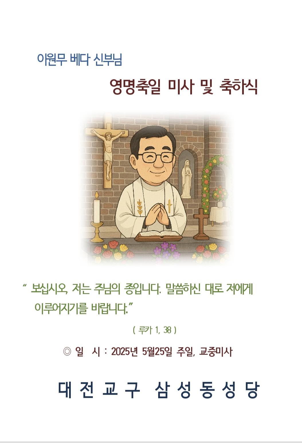 이원무 베다 신부님 영명축일 축하식 작성자에이프릴|작성시간25.05.26|조회수119 목록 댓글 0 글자크기 작게가 글자크기 크게가 다음검색 현재 게시글 추가 기능 열기 북마크 공유하기 신고 센터로 신고 댓글 댓글 0 댓글쓰기 답글쓰기 댓글 리스트