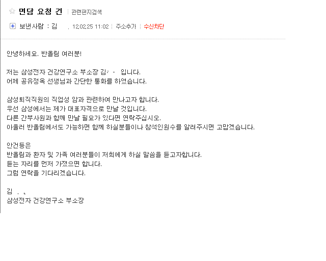 2. 삼성측은 삼성전자 건강연구소 김00 부소장을 통하여, 지난 2월 25일 자로 반올림에 아래와 같이 ‘삼성 퇴직직원의 직업성 암과 관련’한 만남을 제안하여 왔습니다.