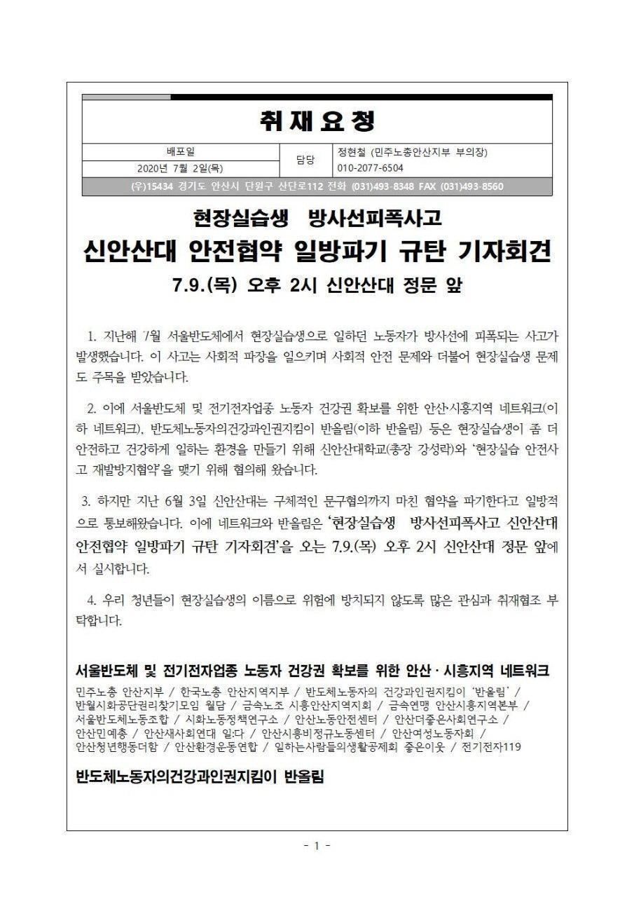 [현장실습생 방사선 피폭사고] 신안산대 안전협약 일방파기 규탄 기자회견 작성자반올림|작성시간20.07.08|조회수216 목록 댓글 0 글자크기 작게가 글자크기 크게가 photo_2020-07-08_11-20-27.jpg photo_2020-07-08_11-20-31.jpg 취재요청-신안산대규탄 기자회견.pdf 첨부파일첨부된 파일이 5개 있습니다. jpg 파일 photo_2020-07-08_11-20-27.jpg 다운로드 jpg 파일 photo_2020-07-08_11-20-31.jpg 다운로드 jpg 파일 photo_2020-07-08_11-20-27.jpg 다운로드 jpg 파일 photo_2020-07-08_11-20-31.jpg 다운로드 pdf 파일 취재요청-신안산대규탄 기자회견.pdf 다운로드 다음검색 현재 게시글 추가 기능 열기 북마크 공유하기 신고 센터로 신고 댓글 댓글 0 댓글쓰기 답글쓰기 댓글 리스트