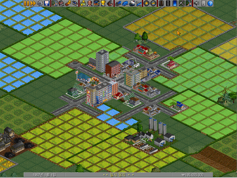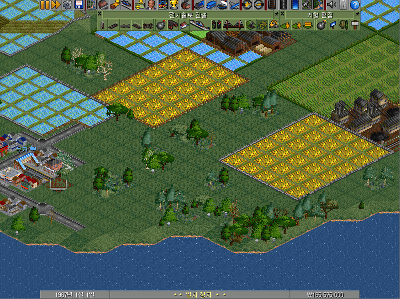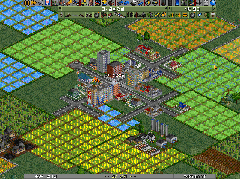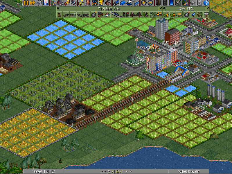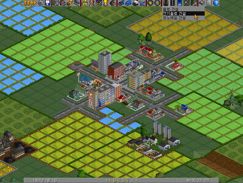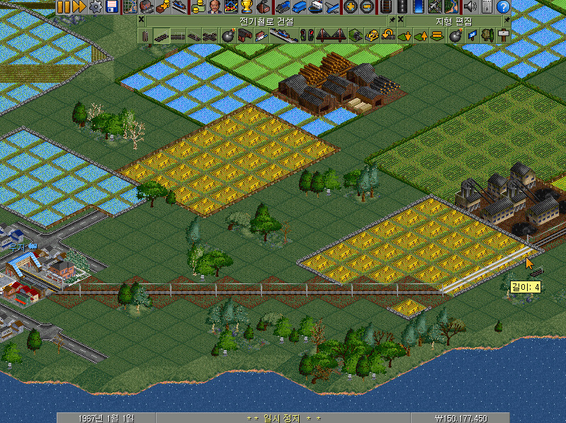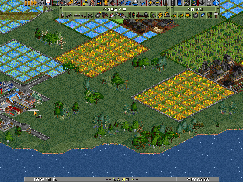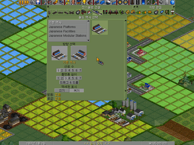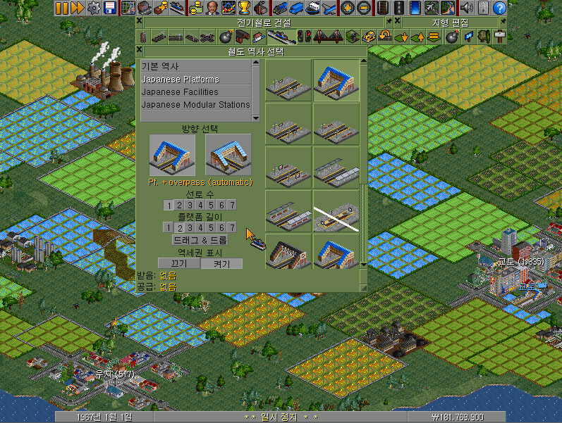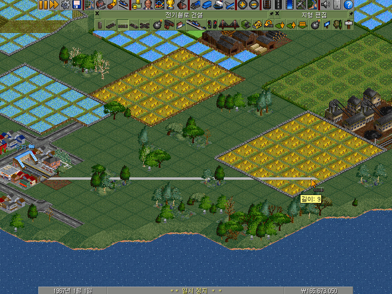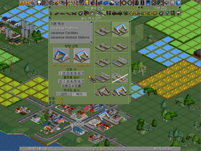 여전히 남아 있는 전기철로 건설 메뉴바에서 왼쪽에서 첫 번째~네 번째의 선로 버튼이 철길을 건설하는 기능을 합니다. 선로 건설 방향에 따라 알맞은 버튼을 클릭하여야 합니다.