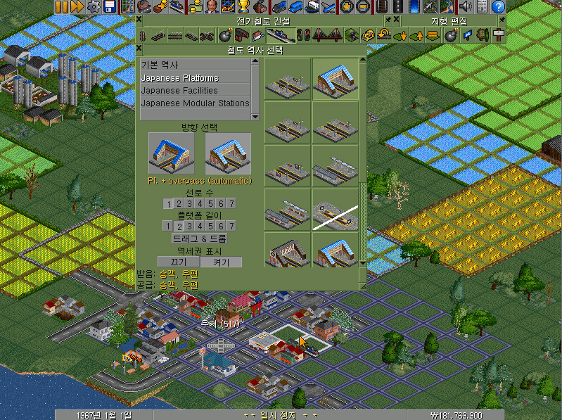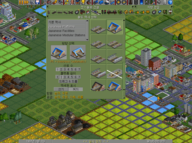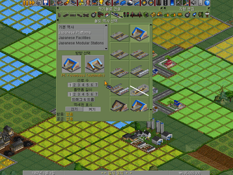 클릭하면 철도 역사 선택이라는 새로운 창이 뜹니다. 여기에서 역사의 디자인과 방향, 선로 수, 플랫폼 길이 등 여러 가지 중요한 데이터를 설정할 수 있습니다. 특히 중요한 것은 방향과 선로 수, 플랫폼 길이이며, 디자인은 아무래도 기능에는 차이가 없습니다. 여기에서는 기본 역사 밑의 Japanese Platforms 를 선택해 보겠습니다.