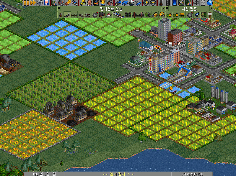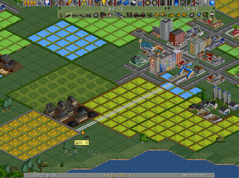 10칸의 전기철도 선로를 건설한 모습입니다. 맨 아래 상태표시줄의 오른쪽 자금을 주목해 주십시오. 1200만 원이 넘는 돈이 빠져나갔습니다.