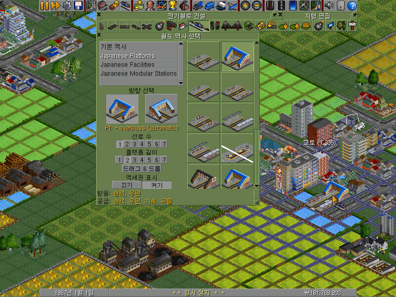 철도 역사 선택 박스의 왼쪽 아래, '받음'과 '공급'에 주목해 주십시오. 여기에 건설되는 역사에서는 승객과 우편을 내릴 수 있습니다(받음). 즉 다른 도시에서 철도를 통해 수송되어 온 승객과 우편은 이 역에서 하차할 수 있습니다. 또한 이 역에서는 교토의 승객과 우편을 싣을 수 있으며, 지금 우리가 다루지는 않을 것이지만 역세권에 농장이 포함됨에 따라 가축과 곡물도 (원한다면) 취급할 수 있습니다.
