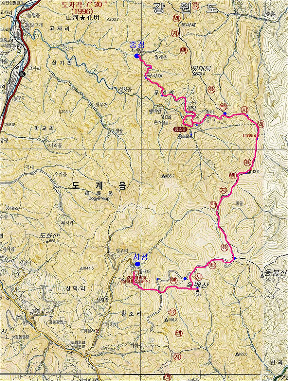 A조 : 강원대캠퍼스-육백산-장군목-1120봉-화전민터-이끼폭포-국시재-소재말-고사리(약 17km...6~7시간)
