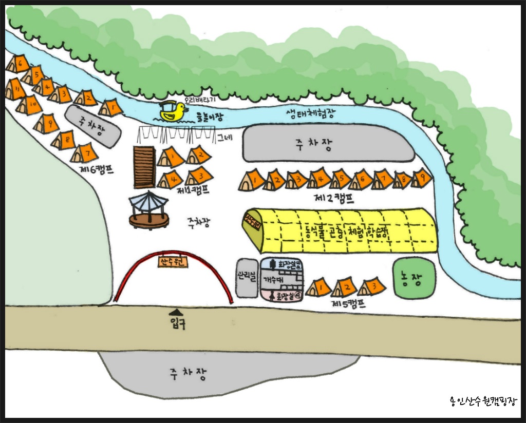 저희 산수원캠핑장의 전경 배치도 입니다.