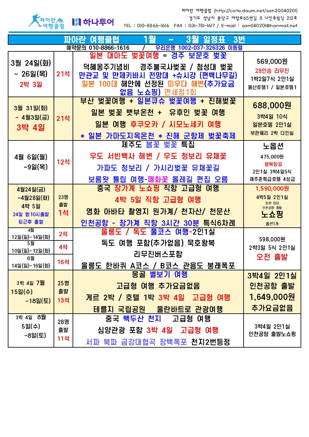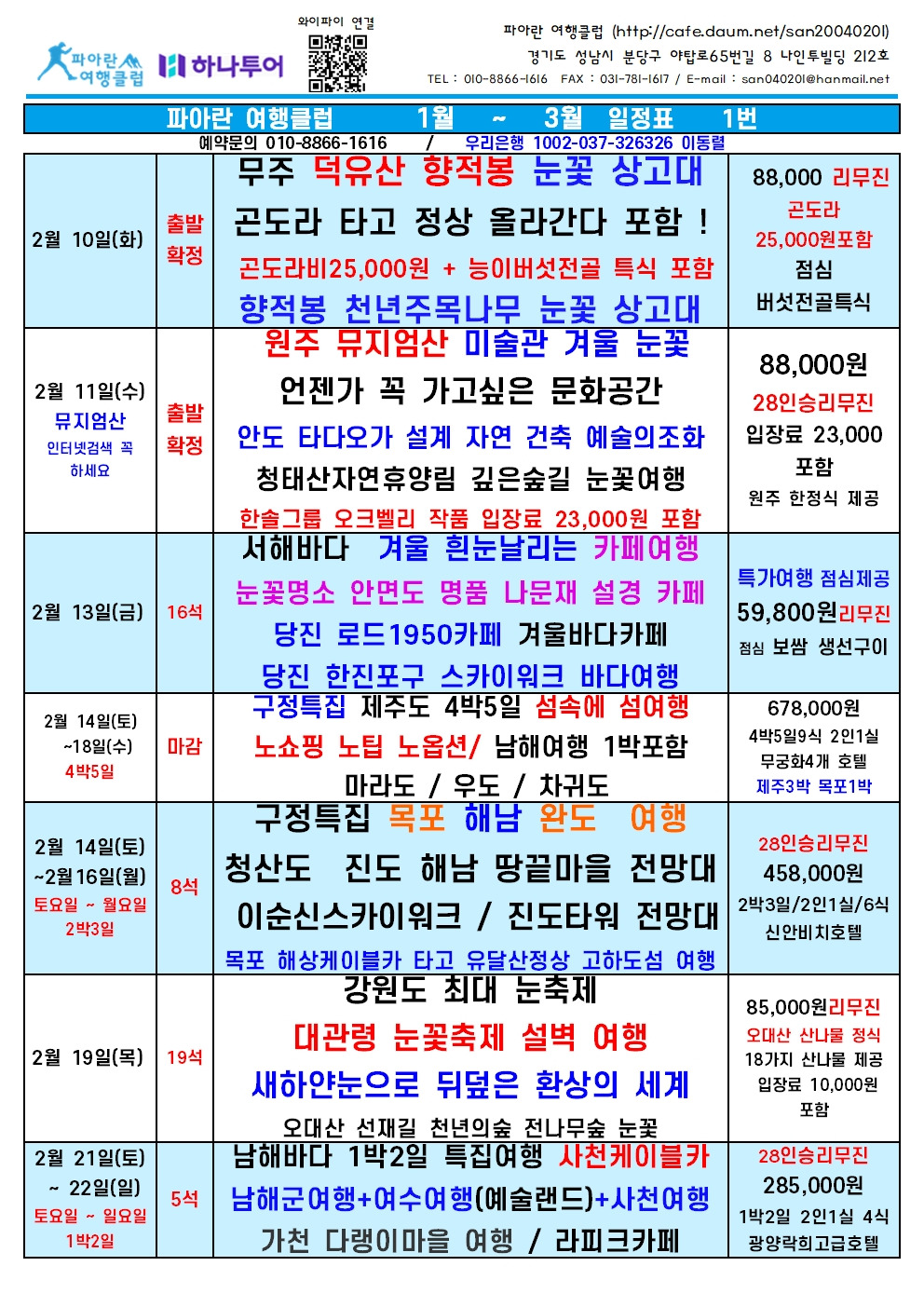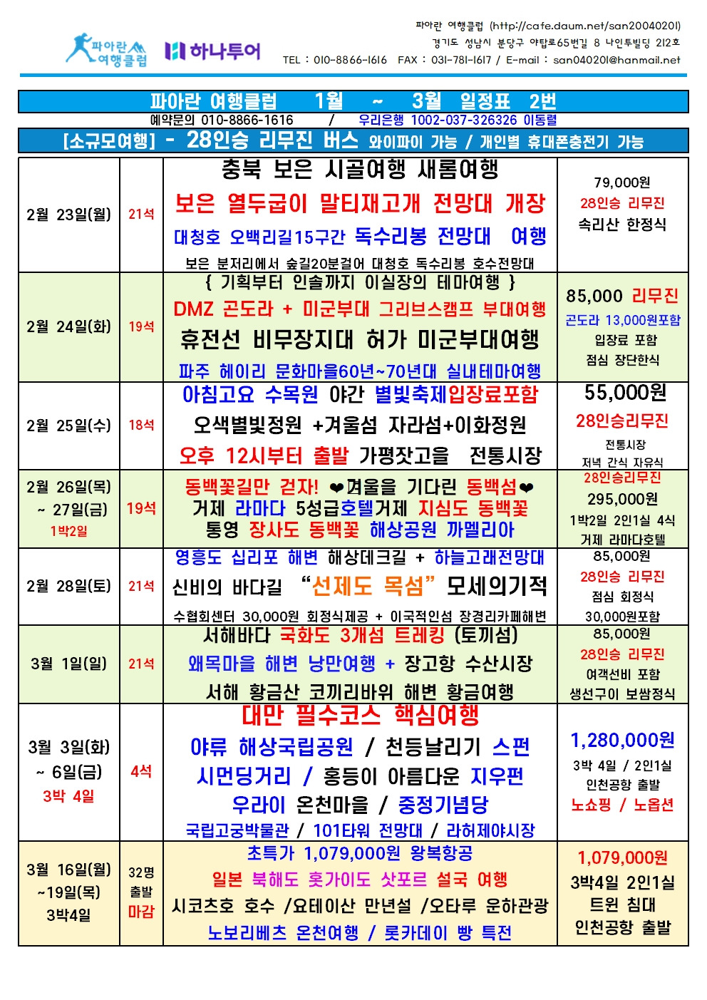 2026년 1월 ~ 3월 = 여행 일정표 예약 010-8866-1616 작성자파아란|작성시간22.04.11|조회수313,418 목록 댓글 0 글자크기 작게가 글자크기 크게가 2026년 1월 ~ 3월 일정표. 파아란 여행클럽db.blueweb.co.kr 다음검색 현재 게시글 추가 기능 열기 북마크 공유하기 신고 센터로 신고 댓글 댓글 0 댓글쓰기 답글쓰기 댓글 리스트