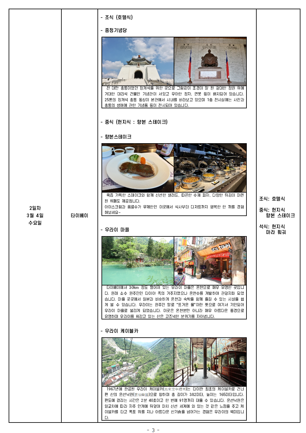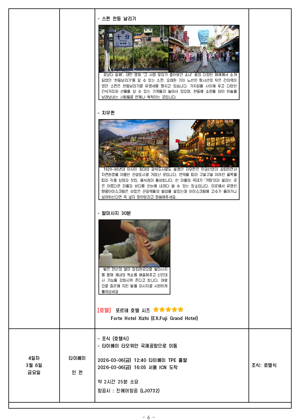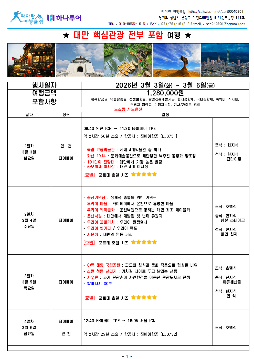 2026.03.03.(화) ~ 03.06.(금) ★ 대만 구석구석 핵심 여행 ★ 작성자파아란|작성시간26.01.06|조회수407 목록 댓글 0 글자크기 작게가 글자크기 크게가 ★ 간략 일정표 ★ ★ 상세 일정표 ★ 다음검색 현재 게시글 추가 기능 열기 북마크 공유하기 신고 센터로 신고 댓글 댓글 0 댓글쓰기 답글쓰기 댓글 리스트