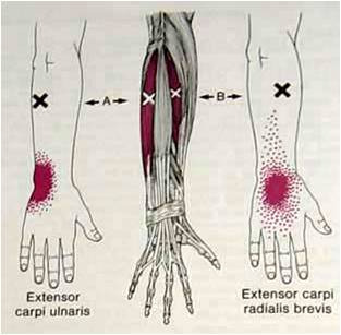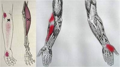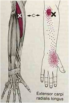 * 상완요골근, 요측수근신근, 회외근, 지신근은 같이 통증유발점발생하는 경우가 흔하다.