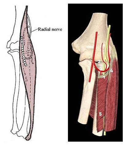 ① 근막교에 hard edge가 발생하였을 때 요골신경이 회외근을 관통하기 위하여 단요측수근신근 밑을 지나갈 때 심부 요골신경에 손상되기 쉽다. (전완이 최대로 회내된 자세에서 가능성이 커진다)
