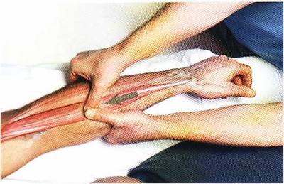 치료하지 않는 손은 환자의 손을 잡아 팔과 손목을 고정시킨다. 척골두 옆의 손목에 무지를 놓는다.