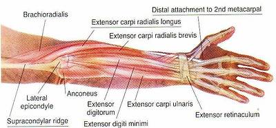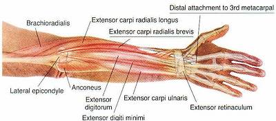 Hand Extensors: Repetitive or forceful handgrip; “wrtiter’s cramps”