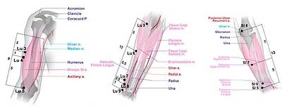 상완요골근(협백, 척택, 공최)-엄지 기저부(합곡)와 손목에 방사 / 외측상과에도 통증을 방사하기도.