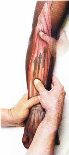 조직을 완전히 압박하여 상완골 외측상과 근위부에 무지를 미끄러지게 한다.