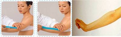 1. 팔을 들어올린 후 약간 구부린다. 팔꿈치 관절 바깥부분에 테이프 한 쪽 끝을 고정시킨다.