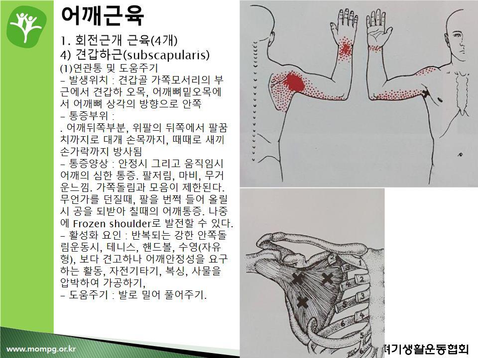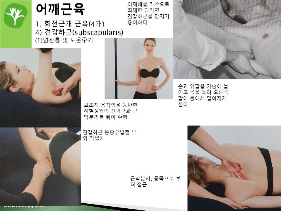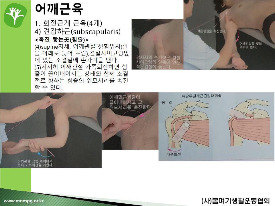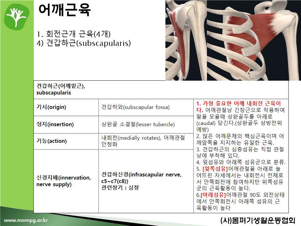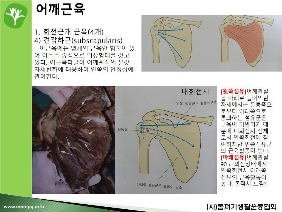 쭉보시고. 위쪽섬유는 팔을 늘어뜨린 상태에서 내회전에 주로 작용하고 팔을 90도 외전한 상태에서는 견갑하근의 아랫부분이 내회전에 주요작동된다고 설명이 되어 있습니다. 이런것은 동작을 해보고 근육을 느낌을 느끼셔야 합니다.